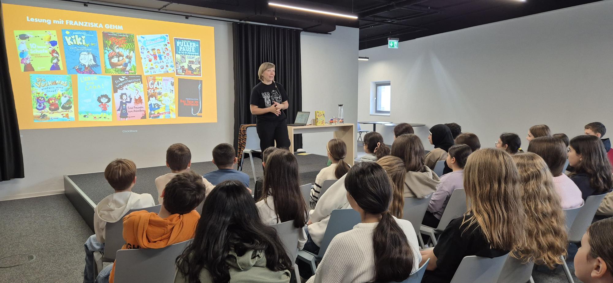 Die Lesung war lebendig und abwechslungsreich gestaltet: Franziska Gehm las nicht nur spannende Passagen aus dem Buch, sondern führte auch auf humorvolle Weise in die Themen rund um künstliche Intelligenz und digitale Herausforderungen ein. Dabei konnte die Autorin immer wieder auf die Fragen und Gedanken der Schülerinnen und Schüler eingehen, was die Atmosphäre sehr interaktiv und anregend machte.