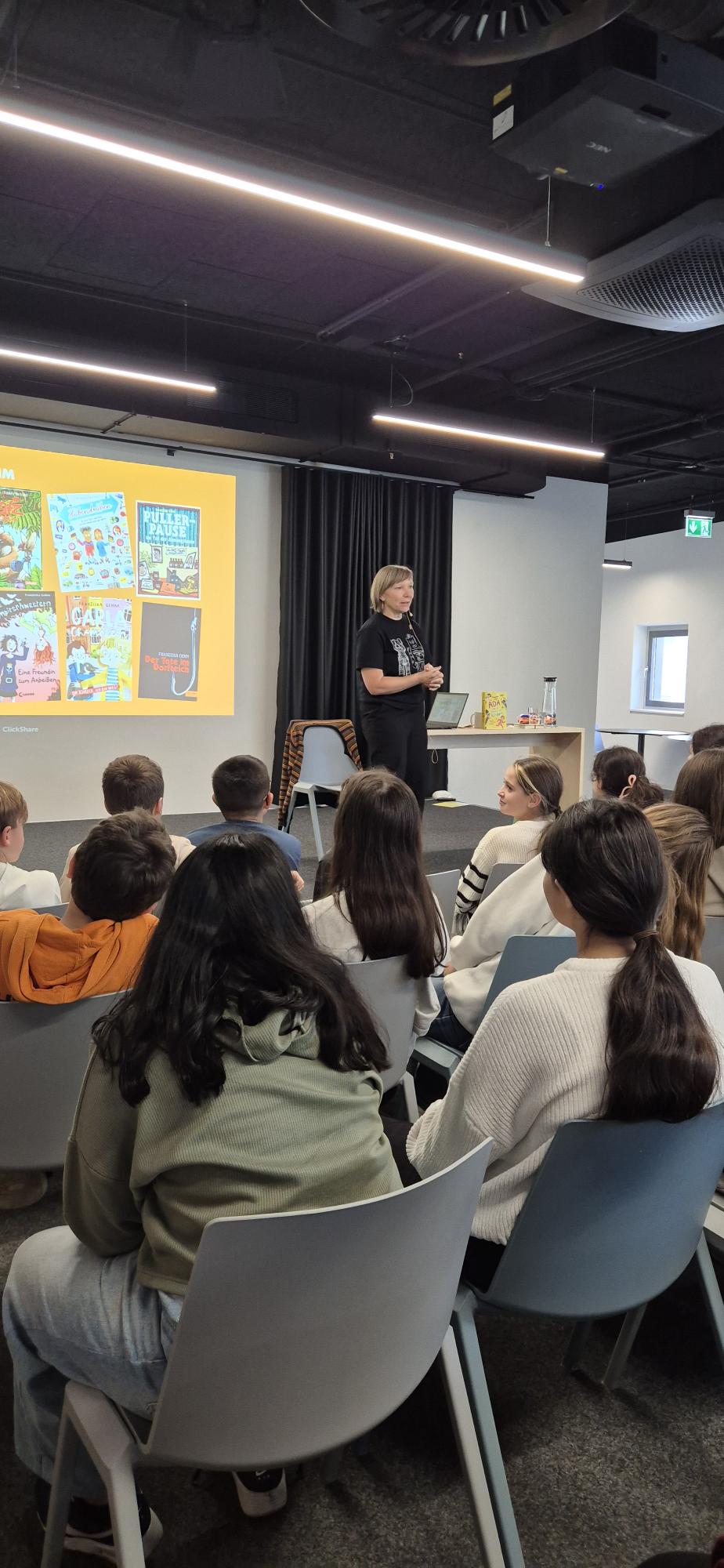 Am 17. Oktober 2025 machten die Klassen 5a und 6b einen besonderen Ausflug zur Stadtbibliothek Heilbronn. Im Rahmen des Frederick-Tages, einem großen Literaturfest für junge Leser, hatten die Schülerinnen und Schüler das Vergnügen, einer Lesung der Autorin Franziska Gehm beizuwohnen. Sie stellte ihr Buch „Ada und die künstliche Blödheit“ vor, das die Schüler sofort in seinen Bann zog.
